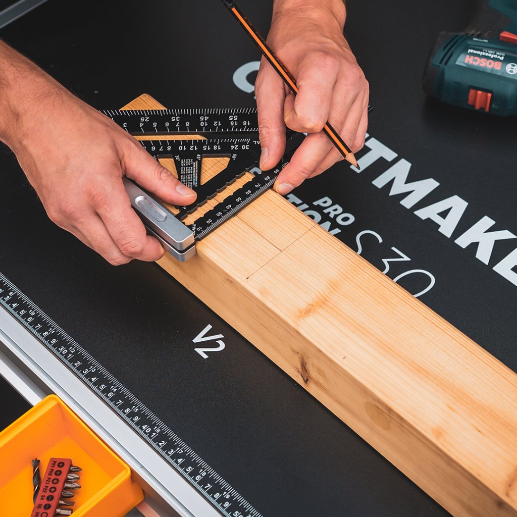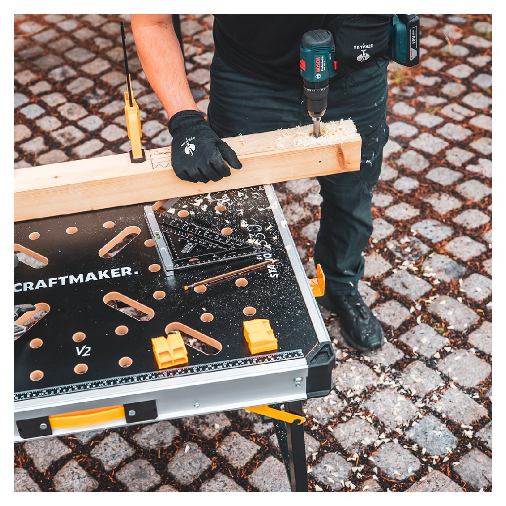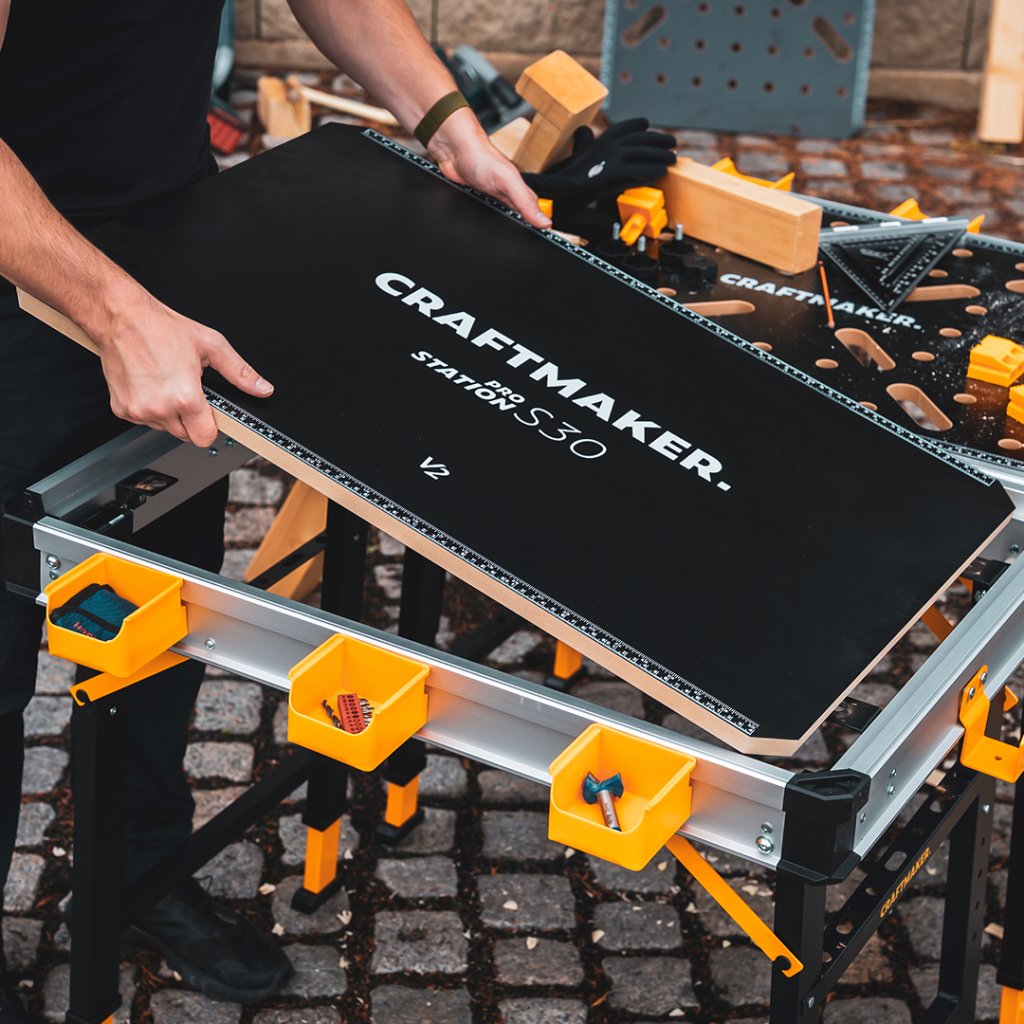 Nueva versión del banco de trabajo plegable multifuncional CRAFTMAKER Pro Station S30 con tablero intercambiable. La V2 le ofrece una superficie de trabajo fácil de desplegar y portátil que ahora se puede sustituir de forma sencilla. Tablero de trabajo de MDF laminado con orificios estratégicamente situados para topes y sargentos. Patas estables ajustables en altura con travesaños para depositar material. Construcción robusta. Compartimentos de almacenamiento. Asa de goma para facilitar el transporte. Capacidad de carga máxima 450 kg. Accesorios incluidos en el paquete.