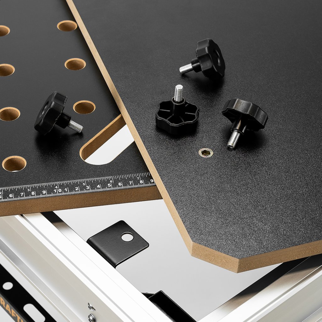El popular banco de trabajo Pro Station S30 llega ahora en una nueva versión mejorada V2. El tablero de trabajo de MDF laminado es totalmente desmontable gracias a las roscas de acero y los tornillos de estrella, por lo que puede cambiarlo rápidamente en cualquier momento según sea necesario. ¿Desea una superficie de trabajo sólida sin agujeros? Ahora también puede adquirir un tablero de repuesto sin agujeros para la mesa. ¿Ha dañado su tablero original debido a un trabajo intensivo? No hay problema: también lo tenemos en nuestro catálogo. Cambie su superficie de trabajo según lo que necesite en cada momento. El paquete incluye un tablero con agujeros para bench dogs y sargentos. El tablero sólido se puede adquirir por separado.