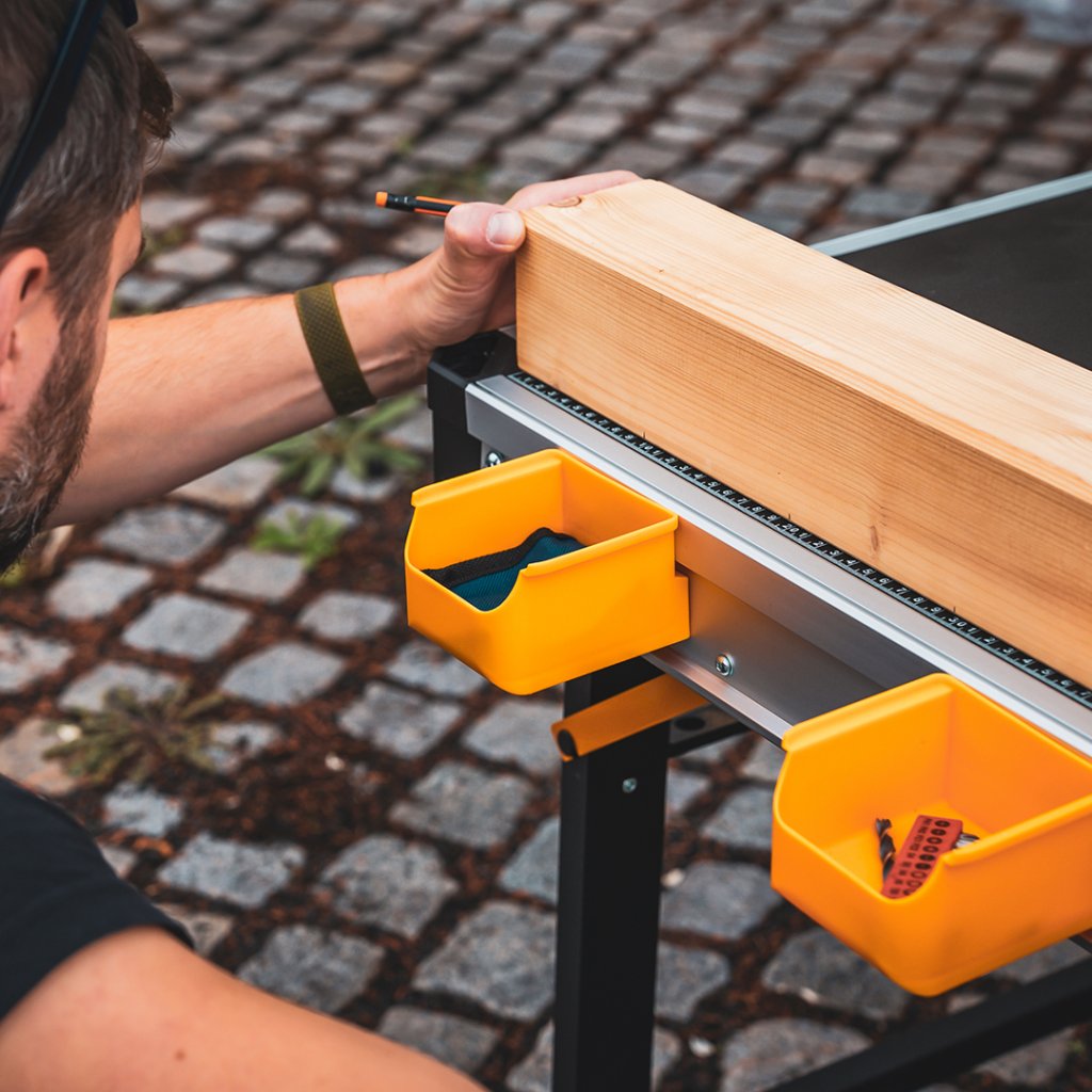 El banco de trabajo portátil CRAFTMAKER con sargentos de carpintería es una superficie de trabajo ideal tanto para profesionales experimentados como para la mayoría de proyectos de bricolaje doméstico para tu casa, tu jardín o tu taller. Se instala rápidamente y se pliega en una maleta: una vez plegado no ocupa mucho espacio. Cabe fácilmente en el maletero del coche o en el cuarto de herramientas. Para cortar, taladrar, lijar y otras funciones. Se puede conectar fácilmente más de una mesa Pro Station 360 gracias a los conectores de plástico incluidos en el paquete. Con ganchos de dos mesas, también se puede montar un caballete colocando sobre él un tablero OSB o un tablero de conglomerado para ampliar la superficie de trabajo. Si necesitas una superficie aún mayor, puede conectar 4 o más mesas entre sí.